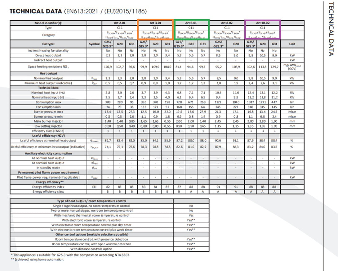 There are nine models with heat outputs from 2.4 to 11.1 kw. They are compatible with natural gas or LPG, require no electrical supply and can be installed on their own or centrally time controlled.