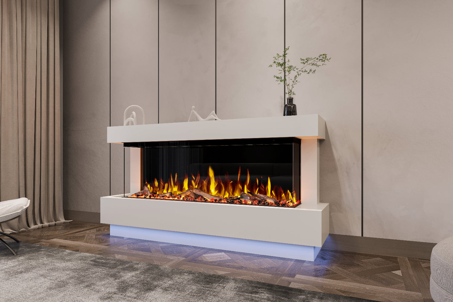 — designed for contemporary feature walls and media installations. Sleek flush-fit casing, ultra-realistic LED flame and fuel-bed effects, multi-colour ambient lighting, and flexible heat control make these premium panoramic electric fires ideal for living rooms, or open plan spaces and commercial feature walls.