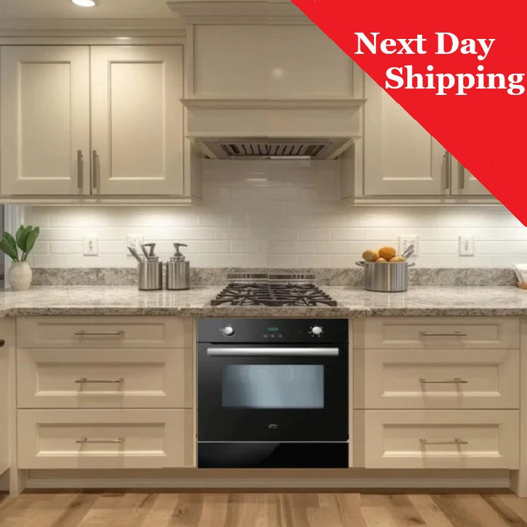 - Black Glass Built In Gas Oven with Electric Grill & Warming Drawer - This double cavity option is fitted under a worktop alongside kitchen cabinets.