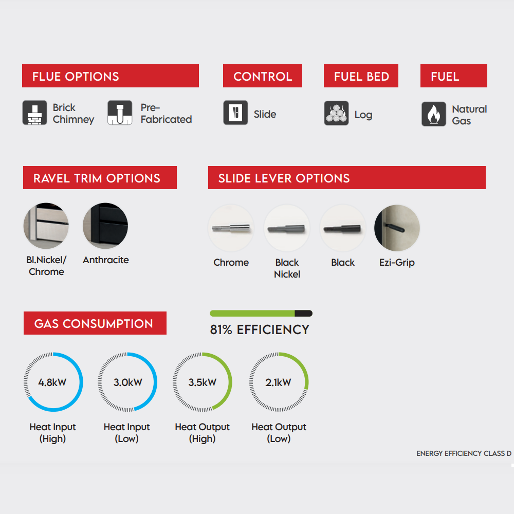 The Ravel 400 HE Log 16”x 22” is a high efficiency glass fronted fire suitable for class 1 and class 2 flues.